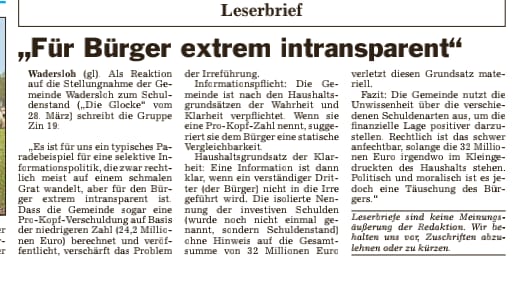 ZIN19 ist selbstverständlich bekannt, dass der von der Gemeinde Wadersloh aufgestellte Haushalt durch den Kreis Warendorf geprüft und genehmigt wird. Das ist auch gut so. Ebenso ist uns bewusst, dass die Gemeindeprüfungsanstalt NRW regelmäßig die Jahresabschlüsse kontrolliert. Diese formalen Prüfungen stellen jedoch keine inhaltliche Bewertung einzelner Darstellungen oder deren Verständlichkeit für die Öffentlichkeit dar. Die Gemeindeprüfungsanstalt NRW saldiert in ihrem Bericht aus dem Jahr 2023 die Verbindlichkeiten des Kernhaushaltes mit denen der verbundenen Unternehmen, um einen „Konzern“-Überblick darzustellen. Würde dies die Gemeindeverwaltung auch tun, wären die Zahlen noch höher und erschreckender! (Quelle: gpa NRW, Überörtliche Prüfung der Gemeinde Wadersloh im Jahr 2023, Gesamtbericht Seiten 51ff).
