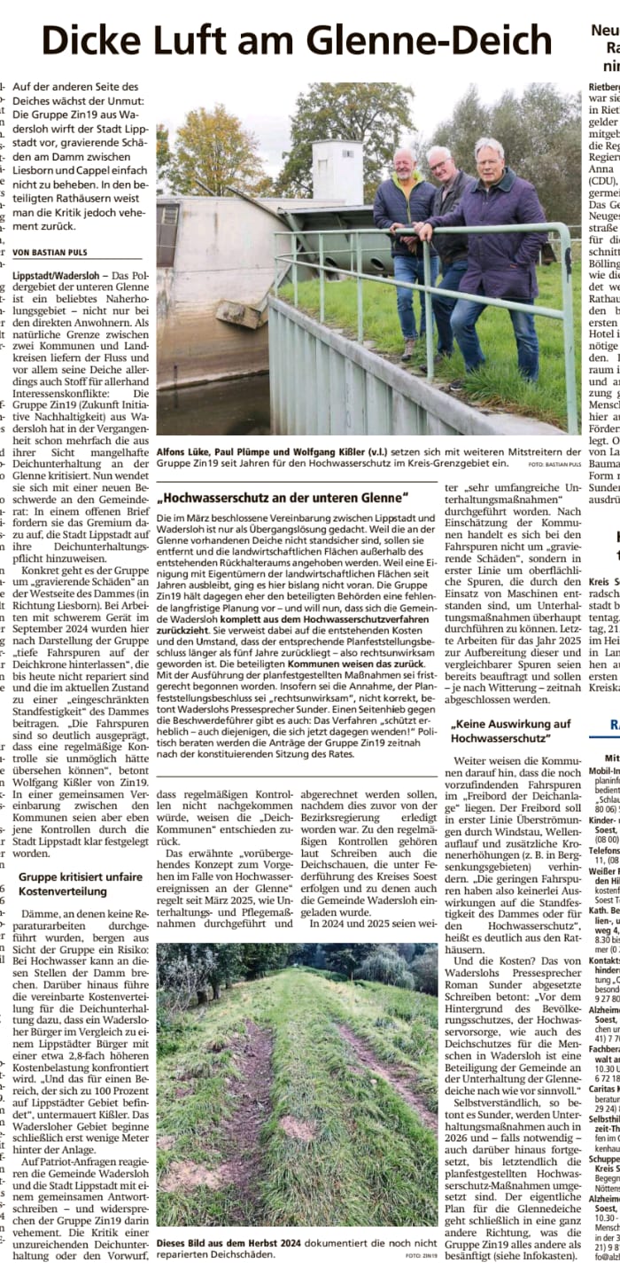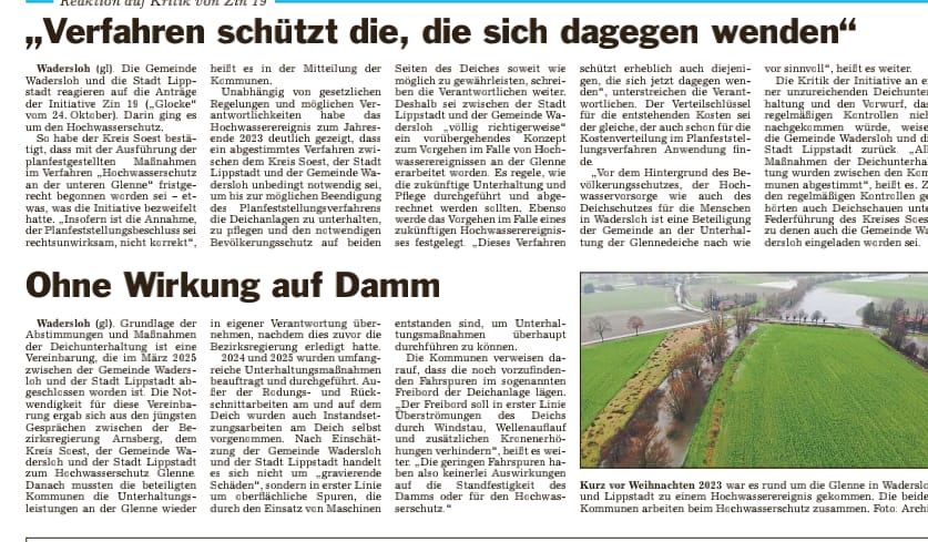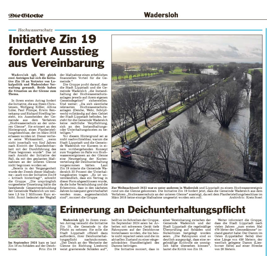 Am 4. November 2019 und am 25. November 2019 haben wir den Bürgermeister der Gemeinde Wadersloh, Herrn Christian Thegelkamp, die Gemeinderatsmitglieder und den Wasser- und Bodenverband der Gemeinde Wadersloh angeschrieben, und den Antrag auf Klärung von Fragestellungen im Zusammenhang mit den Planungen „Hochwasserschutz an der unteren Glenne“ gestellt.